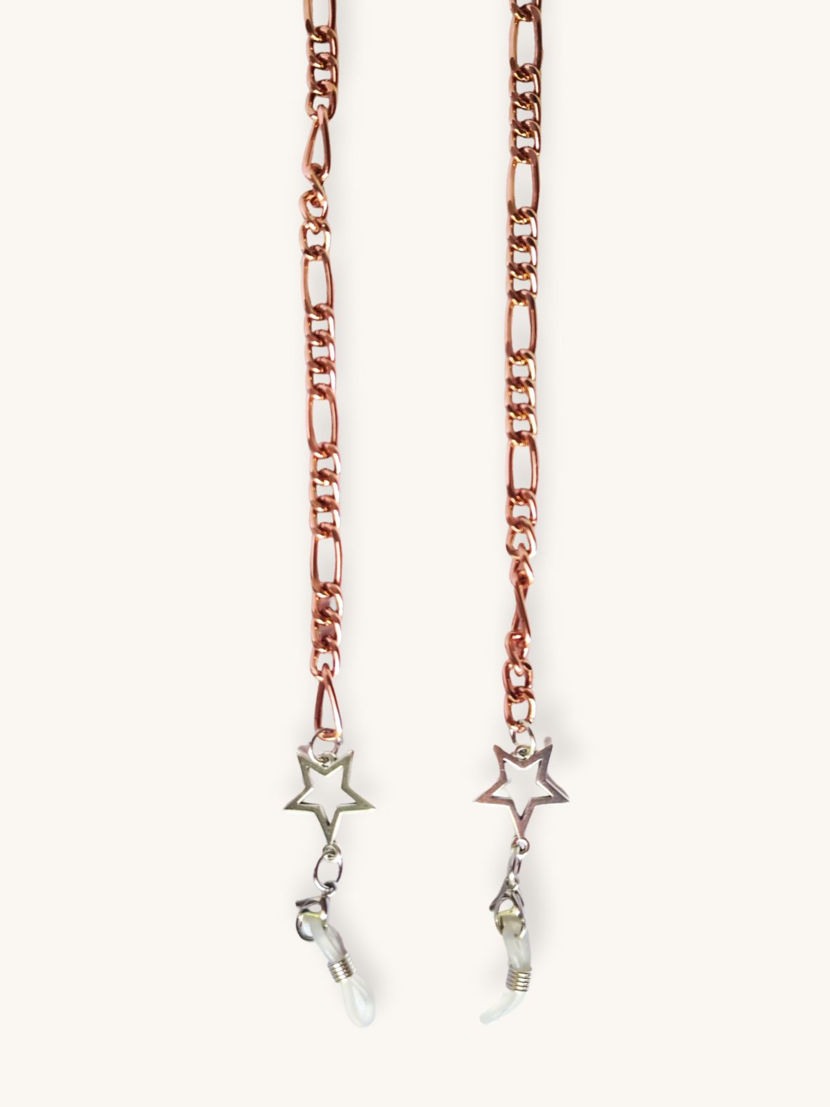Φώτισε το look σου με την αλυσίδα γυαλιών & κολιέ 2-σε-1 σε ροζ χρυσή απόχρωση, διακοσμημένη με ασημί αστεράκια από ορείχαλκο. Κατασκευασμένη από ελαφρύ αλλά ανθεκτικό αλουμίνιο, αυτή η εκδοχή διαθέτει διακριτικά διαφορετικό μοτίφ πλέξης κρίκων, που της δίνει μοναδικό χαρακτήρα.