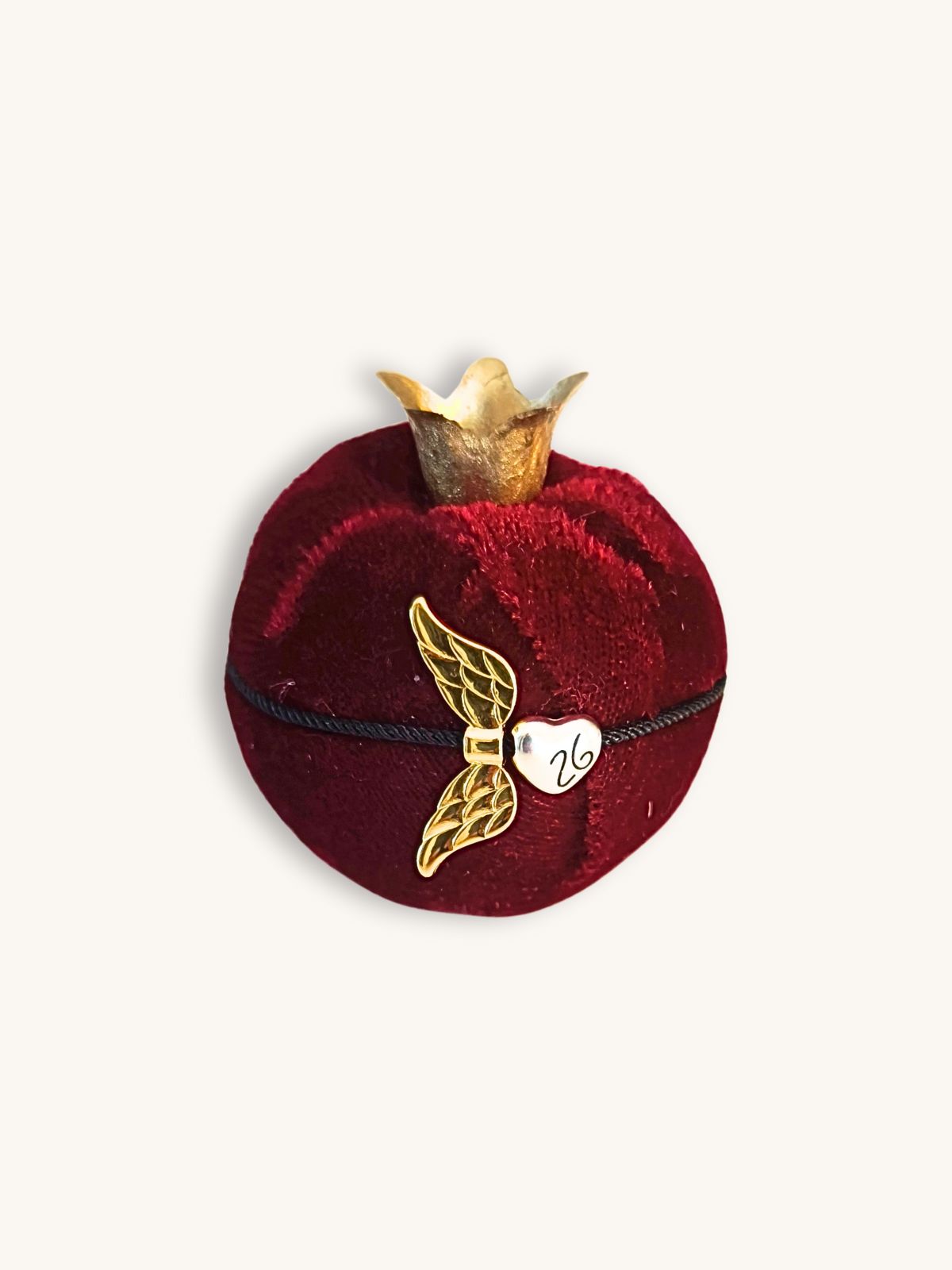Το γούρι ’26 σετ με μικρό βελούδινο μπορντώ ρόδι και χειροποίητο βραχιόλι με χρυσά φτερά αγγέλου & ασημί καρδούλα φέρνει τύχη και προστασία σε μικρό, κομψό μέγεθος — ιδανικό για κάθε χώρο ή δώρο.