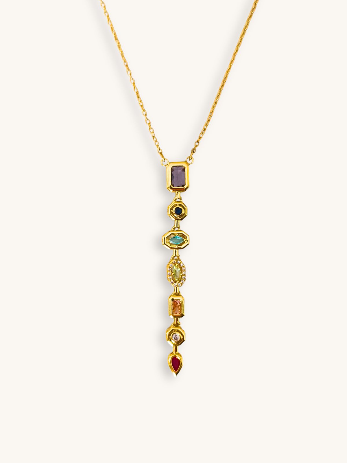 Ένα κομψό κολιέ γραβάτα που ξεχωρίζει για τη ζωντάνια και τη λεπτομέρειά του. Τα πολύχρωμα κρυσταλλάκια συνθέτουν μια κάθετη γραμμή που αγκαλιάζει διακριτικά το ντεκολτέ, δημιουργώντας ένα θηλυκό και μοντέρνο αποτέλεσμα. Η χρυσή απόχρωση του ανοξείδωτου ατσαλιού προσθέτει λάμψη, ενώ η γραμμική του φόρμα επιμηκύνει οπτικά το λαιμό, κάνοντάς το ιδανικό για κάθε εμφάνιση — από καθημερινά looks μέχρι πιο ιδιαίτερες περιστάσεις. Φοριέται μόνο του ως statement κόσμημα και υπόσχεται να μαγνητίσει πάνω του όλα τα βλέμματα.