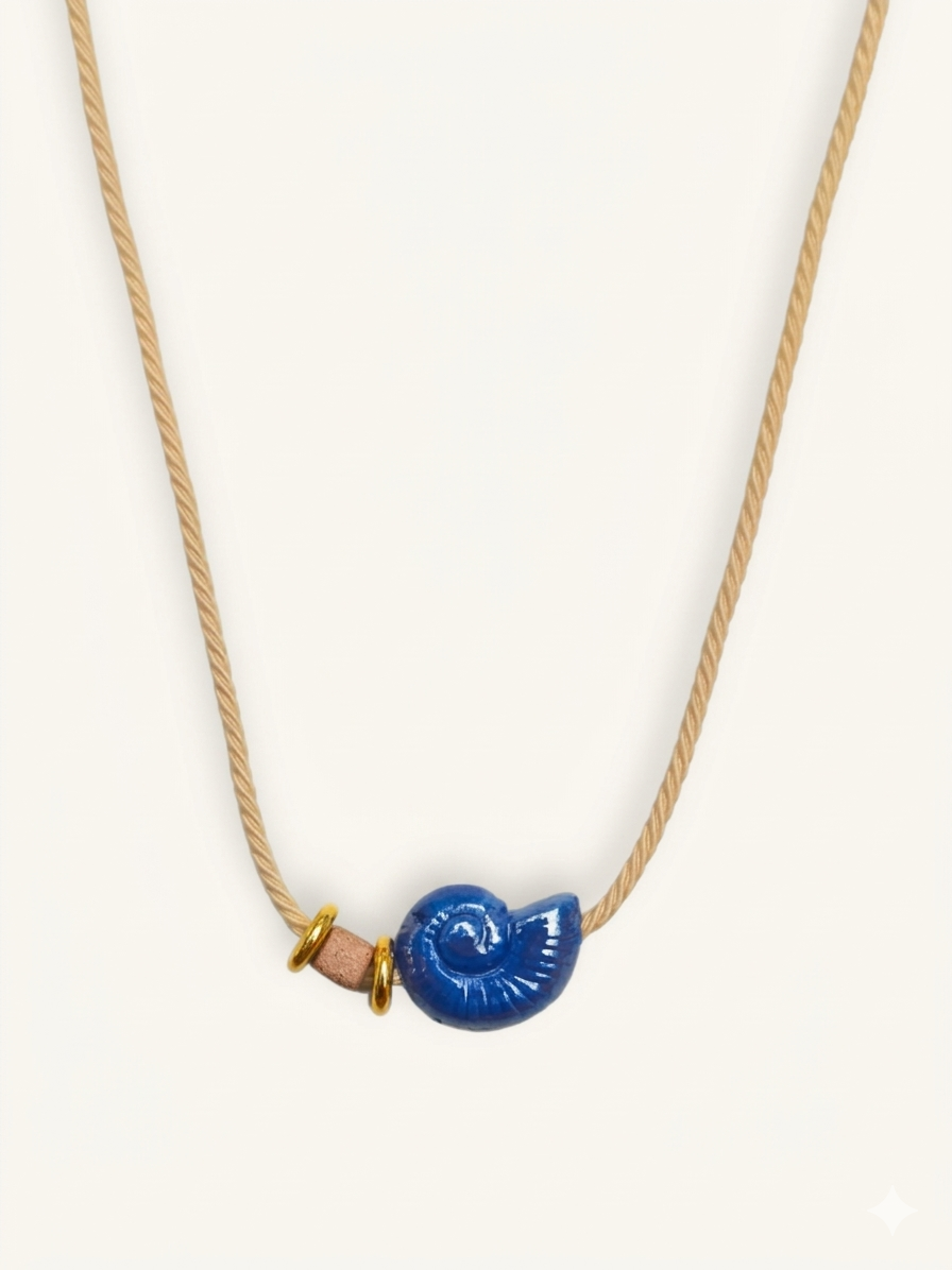 Ένα καλοκαιρινό κολιέ με θαλασσινή διάθεση και έντονο χρώμα. Το μπλε κεραμικό κοχύλι ξεχωρίζει στο κέντρο, φέρνοντας στο νου εικόνες από νησί και θάλασσα, ενώ το μπεζ κορδόνι ισορροπεί το σύνολο με φυσικότητα. Τα χρυσά διακοσμητικά στοιχεία από επιχρυσωμένο ορείχαλκο και η μπεζ χάντρα κυβάκι συμπληρώνουν αρμονικά το σχέδιο, δημιουργώντας ένα κόσμημα ιδανικό για καθημερινή χρήση αλλά και για καλοκαιρινά layered looks.