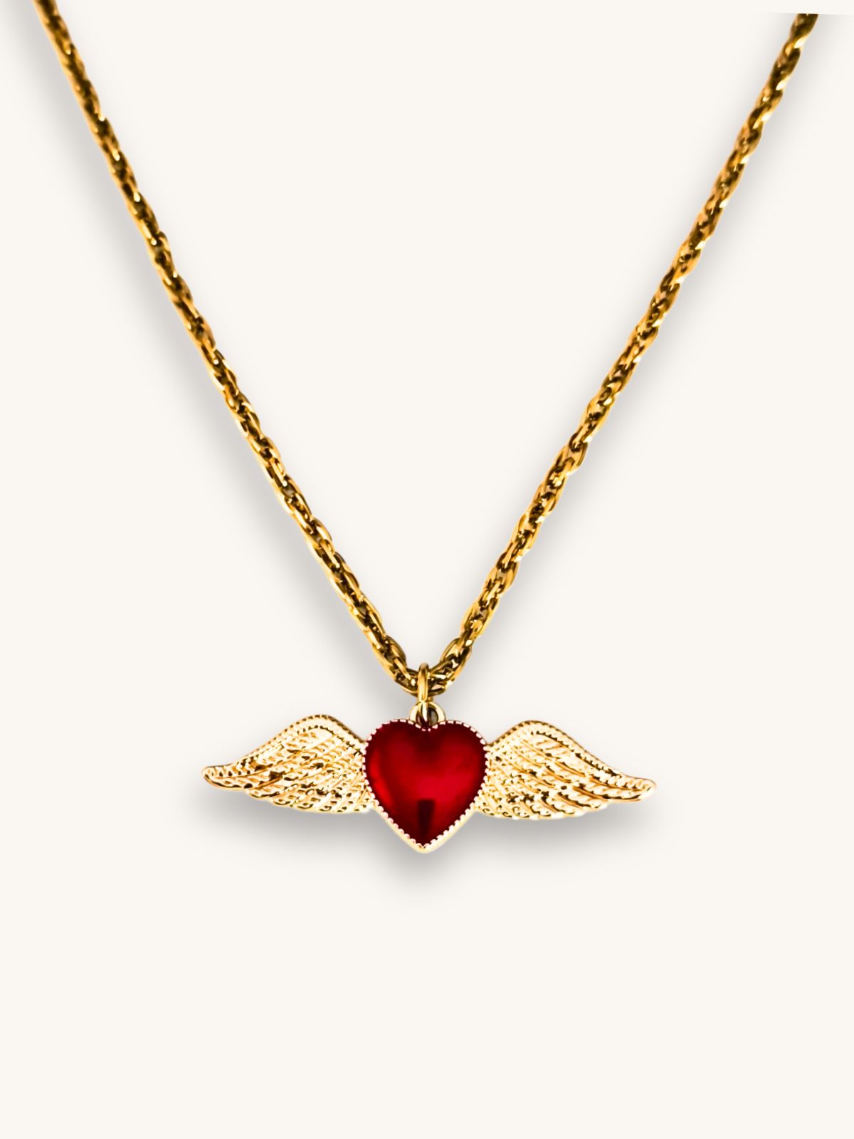 Κολιέ Χρυσή Αλυσίδα με Κόκκινη Καρδούλα & Φτερά Αγγέλου