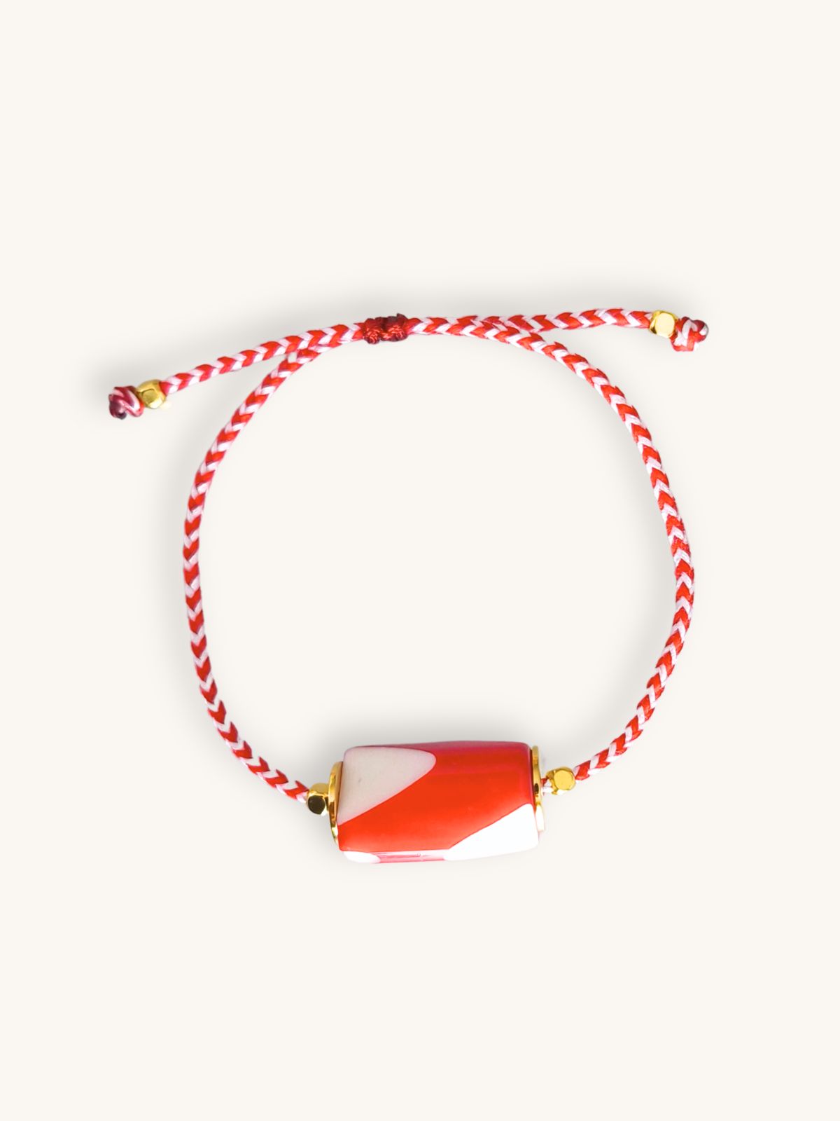 Υποδεχτείτε την άνοιξη με ένα παιχνιδιάρικο και ιδιαίτερο χειροποίητο Μαρτάκι που αντλεί έμπνευση από τη διασκεδαστική candy αισθητική. Το παραδοσιακό κόκκινο-λευκό στριφτό κορδόνι στολίζεται από μια πρωτότυπη ριγέ χάντρα από υψηλής ποιότητας ακρυλικό σε λευκές και κόκκινες αποχρώσεις, θυμίζοντας κλασικά ζαχαρωτά. Η σύνθεση πλαισιώνεται από χρυσά μεταλλικά στοιχεία ορείχαλκου, δημιουργώντας ένα χαρούμενο και φωτεινό αποτέλεσμα που προσθέτει μια δόση ζωντάνιας σε κάθε εμφάνιση. Το βραχιόλι είναι αυξομειούμενο με χειροποίητο δέσιμο μακραμέ, προσφέροντας άνεση και σταθερή εφαρμογή για όλο τον μήνα.