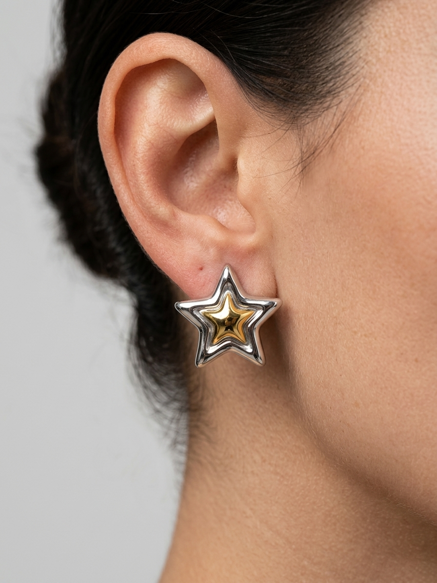 Minimal καρφωτά σκουλαρίκια σε δίχρωμο χρυσό και ασημί με σχήμα αστέρα — ένα κομψό και διακριτικό αξεσουάρ που αναδεικνύει κάθε εμφάνιση. Ιδανικό για καθημερινό στυλ και εύκολο να συνδυαστεί με άλλα κοσμήματα.