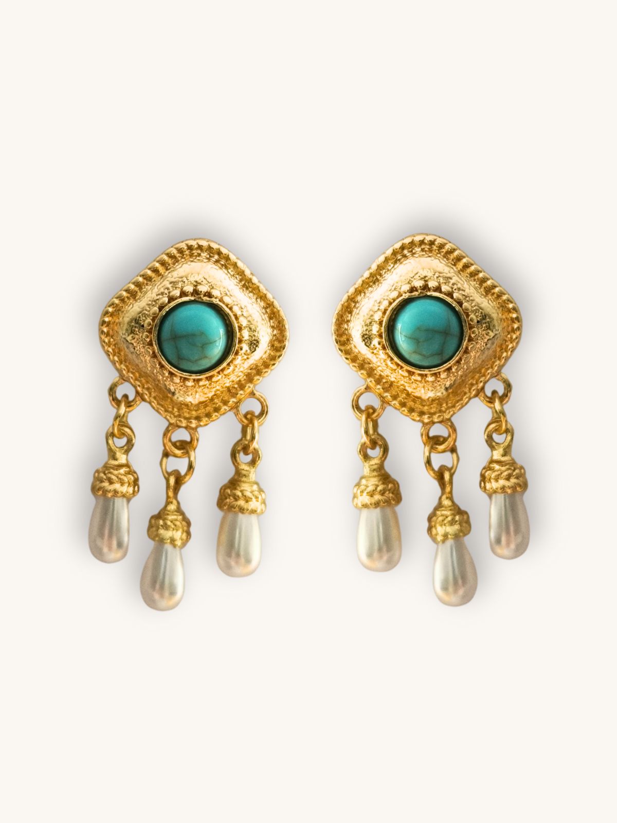 Φέρε boho πολυτέλεια στο στυλ σου με αυτά τα εντυπωσιακά σκουλαρίκια. Ο συνδυασμός του χαολίτη με τις κρεμαστές λευκές πέρλες δημιουργεί μια αίσθηση κίνησης και κομψότητας. Ιδανικά για νησιώτικα βράδια ή elegant resort εμφανίσεις.