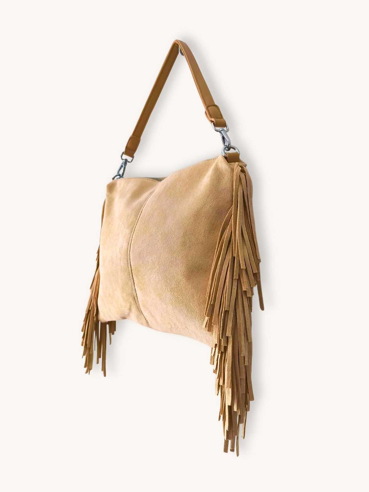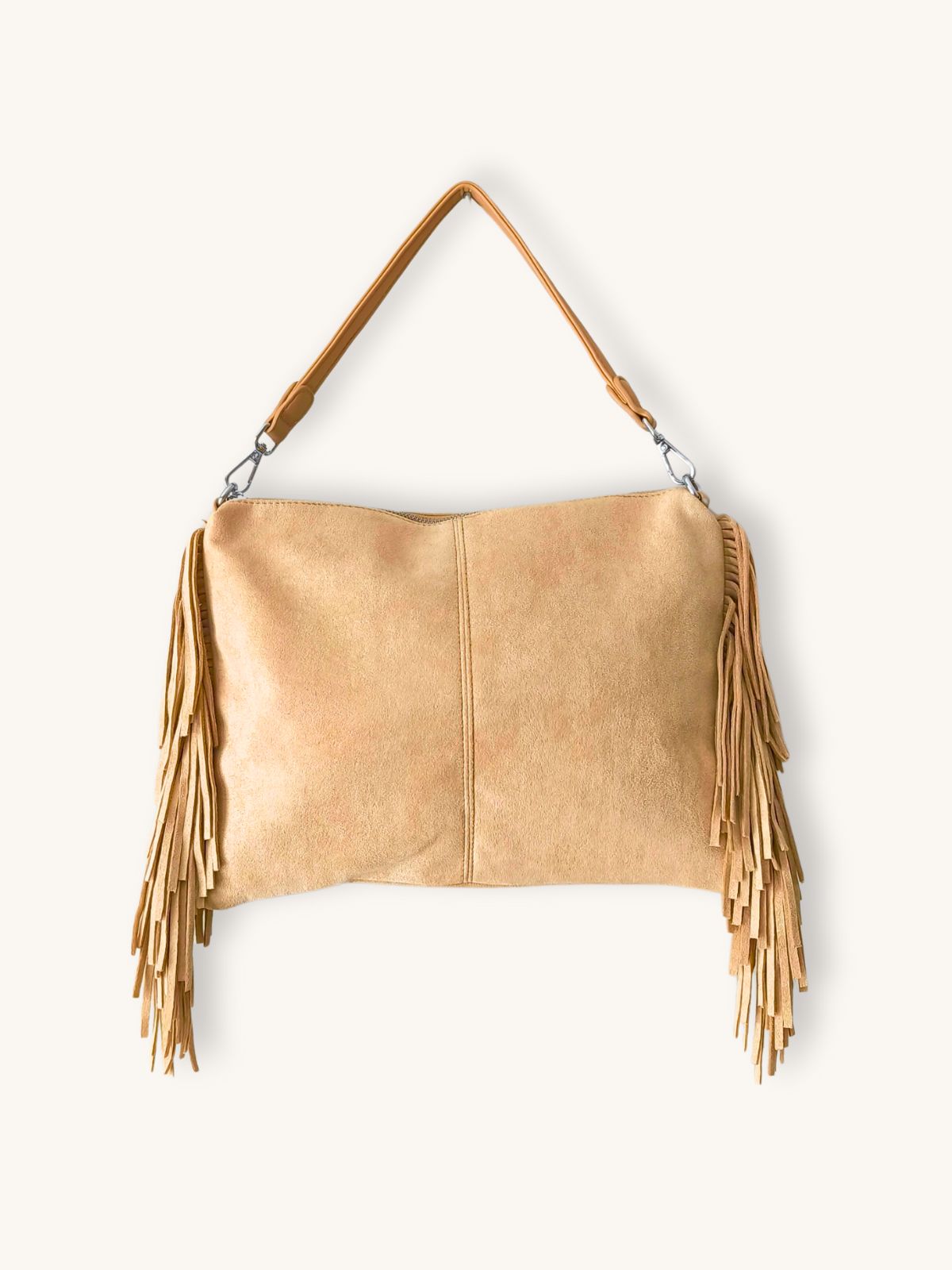 Η τσάντα ώμου μπεζ με κρόσια συνδυάζει boho αισθητική με καθημερινή λειτουργικότητα. Το συνθετικό δέρμα υψηλής ποιότητας σε συνδυασμό με φόδρα πολυεστέρα ιταλικής κατασκευής προσφέρουν ανθεκτικότητα και κομψό φινίρισμα, ενώ το φερμουάρ στο επάνω μέρος εξασφαλίζει ασφάλεια στη μεταφορά των αντικειμένων. Στο εσωτερικό διαθέτει δύο πρακτικές θήκες για καλύτερη οργάνωση, ενώ περιλαμβάνει και δεύτερο, μακρύτερο λουρί για να φορεθεί και χιαστί. Με διαστάσεις 35 εκ. x 25 εκ. χωρίς το λουρί, αποτελεί ιδανική επιλογή για την πόλη, τις καθημερινές εξόδους και κάθε casual chic εμφάνιση.