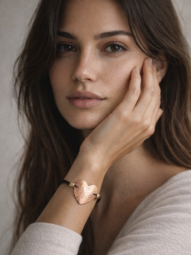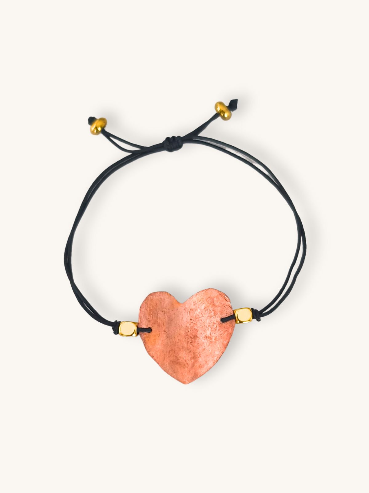 Το χειροποίητο βραχιόλι μακραμέ με σφυρήλατη χάλκινη καρδιά σε ροζ χρυσό συνδυάζει artisanal αισθητική με μοντέρνα κομψότητα. Το μαύρο κορδόνι αναδεικνύει τη brushed, βουρτσισμένη υφή της καρδιάς, δημιουργώντας μια δυναμική αντίθεση που τραβά το βλέμμα. Το μακραμέ δέσιμο προσφέρει άνετη εφαρμογή και ρυθμιζόμενο μέγεθος, καθιστώντας το ιδανικό για καθημερινή χρήση ή ως ξεχωριστό δώρο με συμβολικό χαρακτήρα.