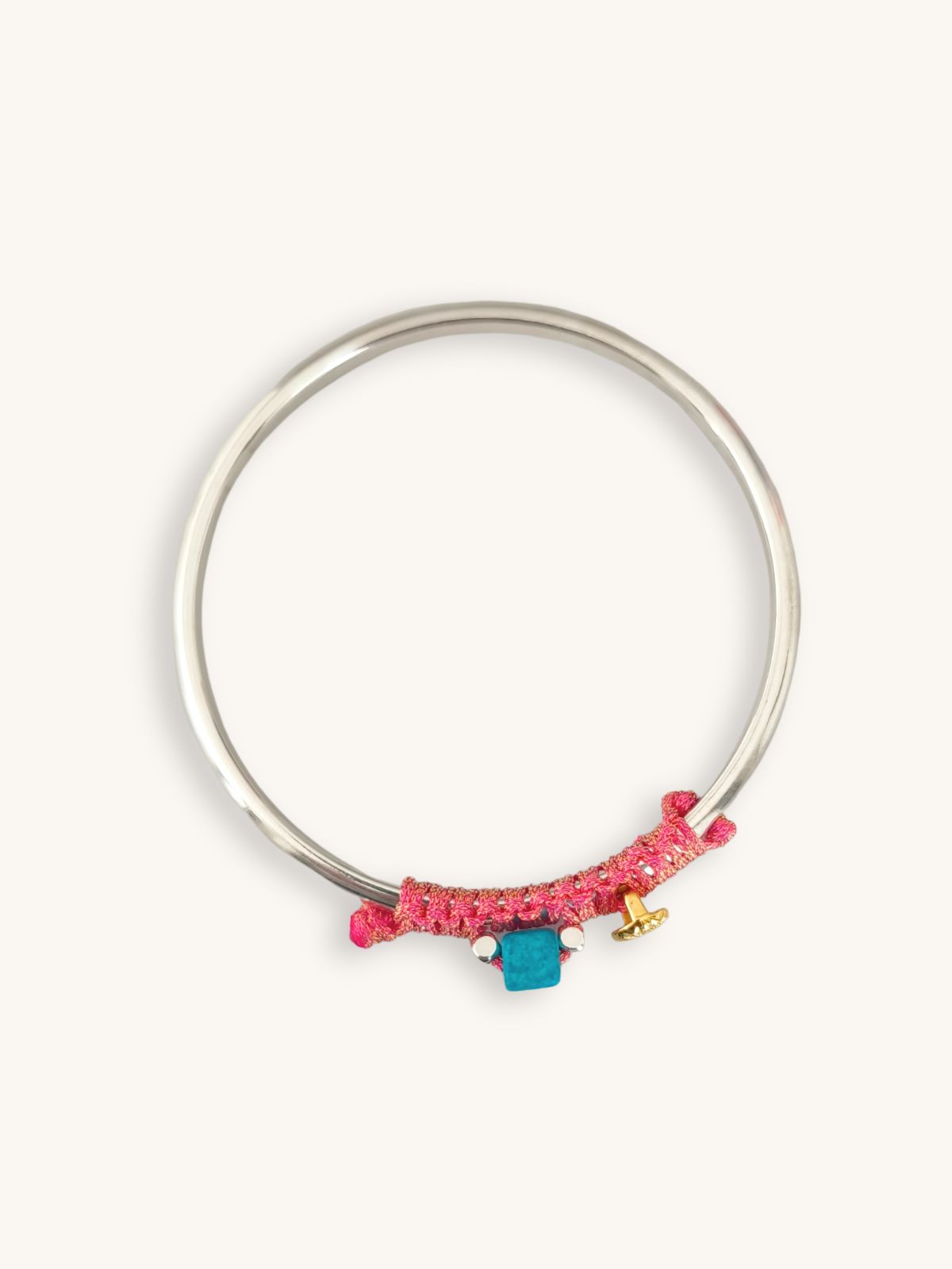 Ένα μοντέρνο βραχιόλι bangle που συνδυάζει τη ζωντάνια της φούξια μακραμέ πλέξης με μεταλλικά και κεραμικά στοιχεία. Το διακοσμητικό στοιχείο σε σχήμα αχινού προσθέτει μια καλοκαιρινή, θαλασσινή αισθητική, ενώ το γαλάζιο κυβάκι χαρίζει μια δροσερή πινελιά χρώματος. Η ασημί απόχρωση του μετάλλου δημιουργεί ένα πιο minimal και σύγχρονο αποτέλεσμα, ιδανικό για καθημερινές εμφανίσεις αλλά και για πιο ιδιαίτερο styling. Φοριέται μόνο του ή σε συνδυασμό με άλλα βραχιόλια για ένα ολοκληρωμένο layered look.