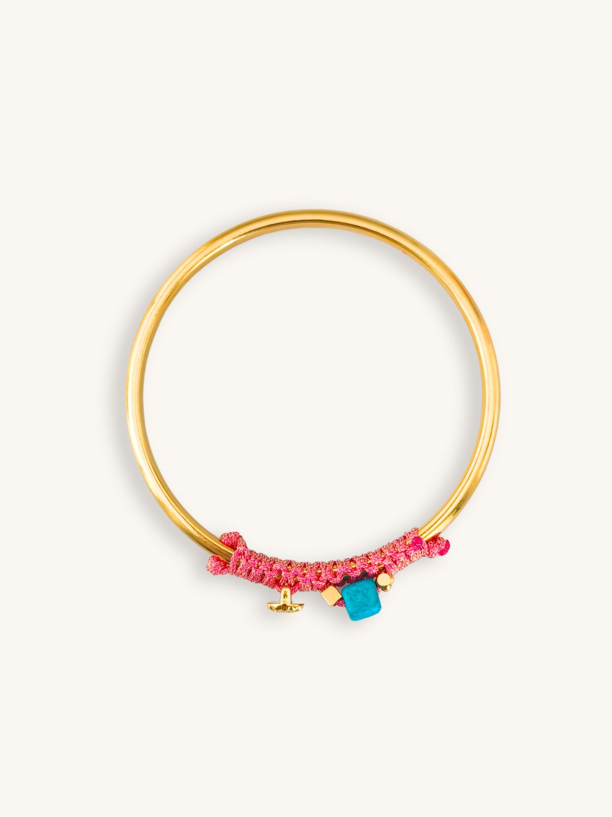 Ένα ξεχωριστό βραχιόλι bangle που συνδυάζει τη minimal γραμμή του μετάλλου με τη ζωντάνια της φούξια μακραμέ πλέξης. Το διακοσμητικό στοιχείο σε σχήμα αχινού προσθέτει μια καλοκαιρινή, θαλασσινή πινελιά, ενώ το γαλάζιο κεραμικό κυβάκι χαρίζει χρώμα και φρεσκάδα στο σύνολο. Η χρυσή βάση από επιχρυσωμένο ορείχαλκο δημιουργεί ένα κομψό αποτέλεσμα που φοριέται εύκολα καθημερινά. Ιδανικό για layering αλλά και για να φορεθεί μόνο του ως ένα ιδιαίτερο statement κόσμημα.